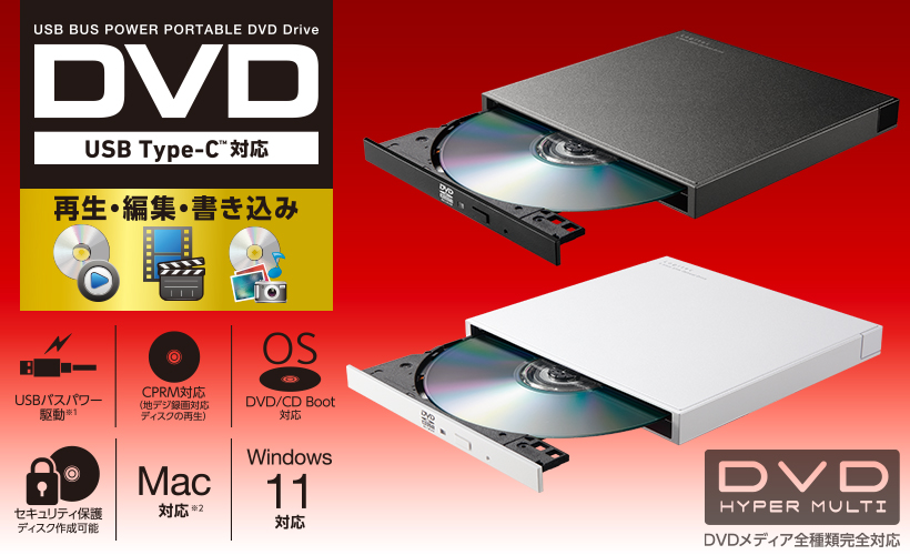 USB Type-C™ 対応 再生・編集・書き込みソフト付き ポータブルDVDドライブ