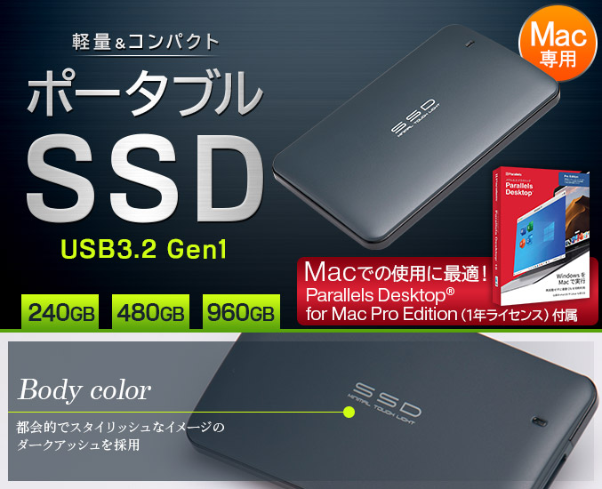 | LMD-SPA240U3M | 240GB | Parallels Desktop® for Mac Pro Edition (1年ライセンス)付属 小型軽量ポータブルSSD |