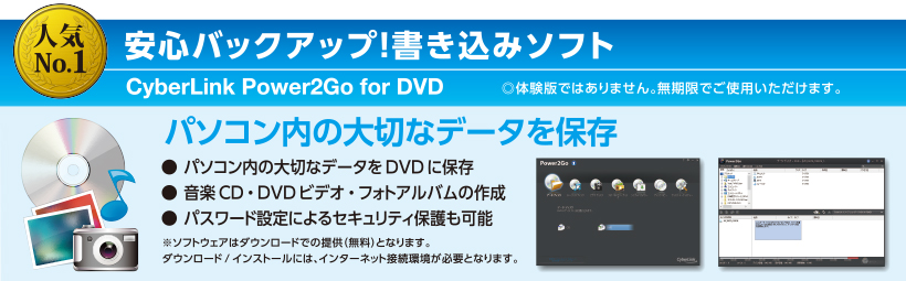 | 付属ソフト | CyberLink Media Suite(データ書き込みソフト:Power 2 Go for DVD) ※無償ダウンロード提供 | |