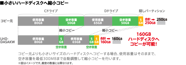 コピーが終了したら、ハードディスクを交換するだけで、使い慣れた現在のシステム環境をそのまま新しいハードディスクに移行することができます。コピー先ハードディスクのサイズが大きい/小さい場合に自動調整して拡大/縮小コピーする機能も搭載しています。